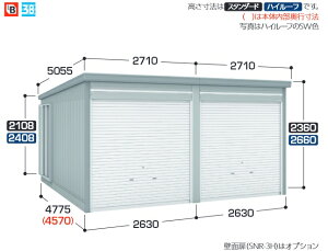 屋根寸法(mm) 間口2290×奥行4555×高さ2660 土台寸法(mm) 間口2130×奥行4275 開口寸法(mm) 幅1842×内部奥行4070×高さ2118 重量 約405kg 床面積 9