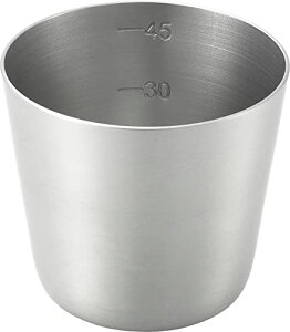 商品名 ジガー 45 商品サイズ 直径56×90mm 上部は直径53mm 商品重量 100g 包装仕様 箱入り 包装サイズ 57×60×95mm 材質 18-8ステンレス鋼 原産地 日本