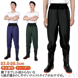 【男女兼用】【23.0-28.5cm】【ウェーダー】腰下までしか浸からないなら脱ぎ履きのしやすいウエストタイプがおすすめ。普通のウェーダーよりも着脱しやすく、ヒップウエダーよりも扱いやすいです。履き心地の良いPVCで作られて...