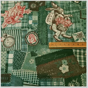 パッチワーク風のプリントの中におしゃれしたウサギや花などヴィンテージ風なテイストがレトロで素敵です