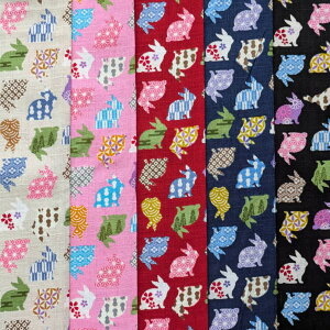 WAモノガタリ ウサギシルエット ウサギのシルエットが並んでいます。その中には青海波、麻の葉、矢絣等の伝統文様が描かれています。 のれん、間仕切りからクッションカバー、バッグやポーチ、小物まで幅広くお使いいただけます...