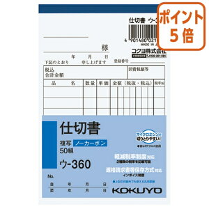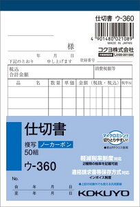 コクヨ NC複写簿 仕切書 B7縦 8行 50組 ウ-360 ●小口が発色していないノーカーボン複写です。保管・保存に優れています。 ●書くとすぐに、圧力で発色するノーカーボン紙タイプ...