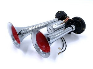 DC12V車専用の3連エアーホーンです。サイズ全長15cm、16cm、20.5cm。素材・材質プラスチック樹脂。仕様DC12V車専用、3連ミュージック音/同時音切替(ミュージック音は公道不可)。