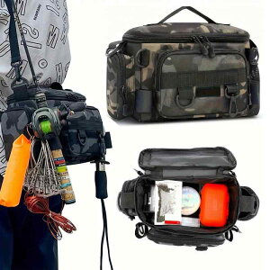 ・カテゴリ: フィッシングバッグ・機能: 餌、釣り糸、リール収納・防水性: 防水仕様・カラー展開: 迷彩グリーン、迷彩グレー、ブラック・サイズ展開: 標準サイズ、大サイズ