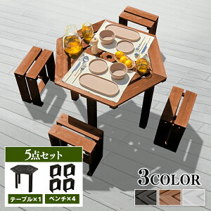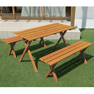 木製のガーデンテーブルとベンチの5点セットです。市販のパラソルが設置できるパラソルホール付き。日差しの強い日も涼しく快適に過ごせます。●セット内容テーブル×1、ベンチ×4●商品サイズ(cm)テーブル:...