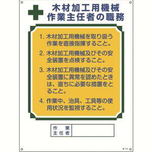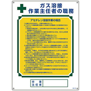 ■労働安全衛生規則に基づく標識です。■作業主任者や作業指揮者等の職務が記載されています。【用途】・当該情報の明示(指示)に。【仕様】・表示内容: ガス溶接作業主任者(アセチレン溶接)の職務・取付仕様: 穴4ヵ所・縦(mm)