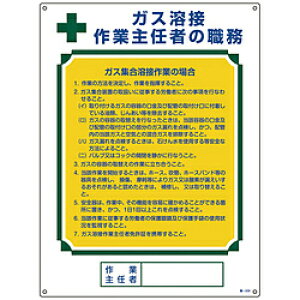 ■労働安全衛生規則に基づく標識です。■作業主任者や作業指揮者等の職務が記載されています。【用途】・当該情報の明示(指示)に。【仕様】・表示内容: ガス溶接作業主任者(ガス集合溶接)の職務・取付仕様: 穴4ヵ所・縦(mm): 6