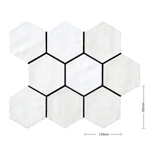 モロッコの伝統的なゼリージュ・タイルをモチーフにしています。明るい色調のベース色にボタニカル柄と六角形のバリエーションを加え、現代的な空間を提案するシリーズ。壁タイルで130mm角の大きさは、ヨーロッパでは手づくりタイルと