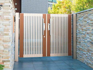 【YKKAP】鋳物+たてリブモールのインダストリアルデザインの門扉です。サイズ幅 1200.0mm × 高さ 1200.0mmカラー木調カラー(門柱:アルミカラー)素材アルミ。