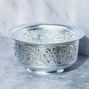 ■インド伝統唐草エンボスの脚付きアルミボウル 水盆 直径13cmの詳細 素材アルミニウムおことわりインド製の柔らかいアルミニウム製品ですので、凹みやゆがみがございます。また、インド製のアルミ製品には、色むら、変色が見られます。