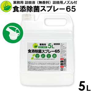 商品説明商品説明 【送料無料】食添除菌スプレー65 業務用に便利な詰替液 5L(詰替用ノズル付)です。 日本製で安心のエタノール製剤です。 危険物ではありません。 (法令による保管場所・保管量の制限、許可申請手続きなどは不要で