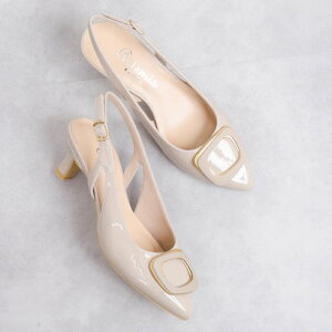 大人っぽい輝きのマットゴールドと、本体と同色のバックルを重ねたモチーフがポイントのバックベルトパンプス。・エナメルのツヤ感とマットなバックルの対比が新鮮。・バックルのカッチリ感と、バックベルト・サイドの