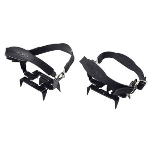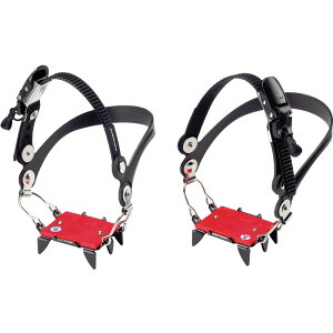 4本爪アイゼン・バックル式。ワンタッチバックル&ストラップ方式を採用し、簡単に装着可能。巾がアジャストする(調整可能)のでフリーサイズに対応。ボール状のスノープレート付きなのでアイゼンに雪が付く(雪がダンゴ状に附着する