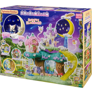 ふしぎな妖精の森と、月夜に浮かぶ魔法のお城、星の妖精、フェネックの赤ちゃんのセットです。 星やクリスタルはキラキラ輝きます!どうくつの滝は、お城や月に続くひみつの入口になっています。 木のおじいさんや、かたつむりとどん