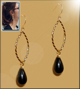 お勧め丸玉オニキス、大粒ドロップオニキスとサークルモティーフを、繋ぎ合わせたアイテムです。耳たぶから下がる、ちょうどよい長さが、ヘアースタイルを選ばない仕上がり。ゴールドトーンのカラーとブラック オニキスの煌きが...