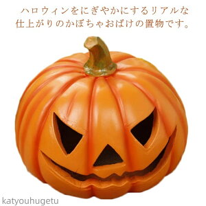 ハロウィンをにぎやかにするリアルな仕上がりのかぼちゃおばけの置物です。幅約21cm高さ約17cmのやや大振りでずっしりと存在感のあるパンプキンです。ホームパーティーの小道具として、店舗や事務所を彩るオブジェとしてハロウィンの雰