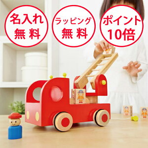 やさしい木の素材と人体に害のない安全な塗料で作られた木のおもちゃ8分音符4人の消防隊員さんをのせたはしご車。 はしごを斜めに上げて、消防隊員さんをはしごの上に引っ掛けると、カタカタと回転しながら降りていきます! はしごは角