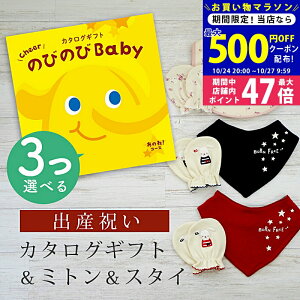 ベビーミトン1セット・スタイ1枚・カタログギフトのびのびBaby《あのね!コース》一冊(申し込みはがき3枚)。化粧箱サイズ 22×22×2cm。《ミトン》◆サイズ:たて10×よこ7.5cm◆素材:綿100%◆原産国:日本製...