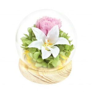 夏のお花を取り入れた仏花をガラスドームにアレンジしました。お仏壇に時節を感じて頂ける仏花です。ガラスドーム内にアレンジしていますので、保護性能も高くホコリを防いでお手入れの手間がかからないお供え花です。サイズφ10×H10.2cm