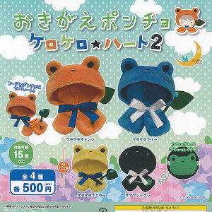 三日月うさぎ 500円カプセル自販機商品のフルコンプです。【おきがえ ポンチョ ケロケロ ハート 2 全4種+ディスプレイ台紙セット】★ラインナップの種類は以下となります。 1:ケロケロオレンジ 2:ケロケロブルー...