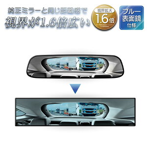 純正ミラーに簡単取付け よく見えるワイドルームミラー 視界拡大1.6倍! 純正ミラーの上に取り付けるだけ! 自然な距離感のまま純正ミラーより視界が1.6倍広くなる! ミラーの上に取り付けるだけの簡単設置で便利。 ブルー表面鏡仕様で後