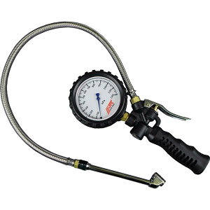 自動車の空気を入れる空気入れ メーター付きのタイヤゲージになります。 実際の整備工場でも利用されているオイル式メーターが搭載された本格的な製品です。 加圧、減圧、測定が可能になります。 メーターはオイル式になり測定が正確で機械式と