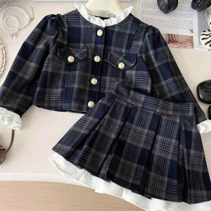 ・カテゴリ: 子供用セットアップ・性別: 女性・セットタイプ: スカートセット・セット点数: 2点セット・対象年齢: 3〜8歳・袖丈: 長袖・生地加工: 柔軟加工・厚さ: 普通・柄: 格子・デザイン要素: 格子、レース、トレンディ・生...