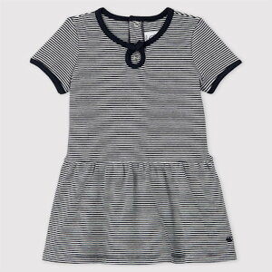 プチバトーを代表するミラレボーダー、首元のリボとワンポイントのブランドロゴ。 ブランドを代表するアイコニックなミラレボーダーの半袖ワンピースです。首元に配されたリボンが、デザインのアクセントに。落ち着いた品のあるデザイ
