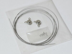 ネックレス製作に欠かせない、ワイヤ、ボタン式留金2対、つぶし玉10個をセットにした3点キットです。慣れた方なら、ネックレス2本製作可能です。当店のビーズと一緒にどうぞ!画像3枚目はこのキットを使用して作ったサンプル作品です。