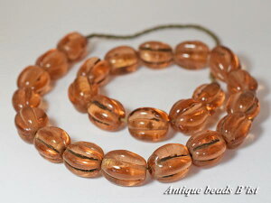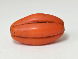 艶のあるセミクリアサーモンオレンジ色卵型の母胎に筋が施されたガラスビーズ一連です。パキスタン等では、このビーズを連にして壺等を装飾するそうです。ネックレスのTOPにすると可愛いと思いますよ〜!やや汚れがありますが...