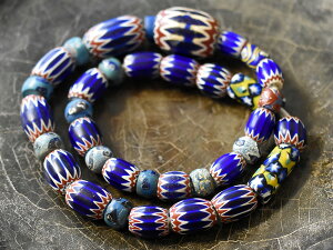 近年入手が大変難しくなってきたヴェネチア産のアンティーク6層ブルーシェブロン中大粒ビーズとヴェネチアントレードビーズのミックス一連です。シェブロンはどれも良質のものばかかりですが、小さめサイズの4層シェブロンが21個中4粒