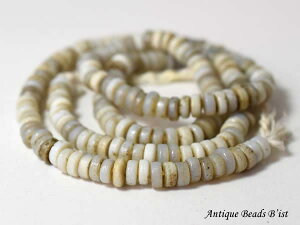 インドネシア産の乳白色のディスク型ガラスビーズ一連です。古色加工が施された、アンティーク調の大変雰囲気の良いビーズです。ハンドメイドアクセサリや手芸用のパーツにおススメです。粒の大きさや形状にはばらつきがあります...