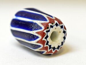 ジャワ島原産の美しい色合いの大玉です。白、青、灰色の杉綾(ヘリンボーン)のような模様が施されています。現代のものですが、雰囲気の良いビーズです。状態は概ね良好です。写真はサンプルとさせていただきますが、ほぼ同等のもの