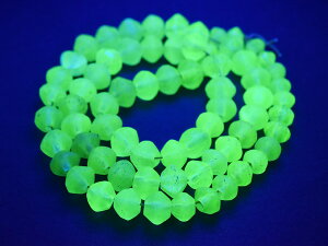 チェコ産の緑色のウランガラス算盤型ビーズ一連です。ウランガラスは19世紀から20世紀前半にかけて、ボヘミア地方で短期間しか生産されなかった希少で有名なガラスです。ブラックライトを当てると美しく、神秘的な蛍光色を発します(画