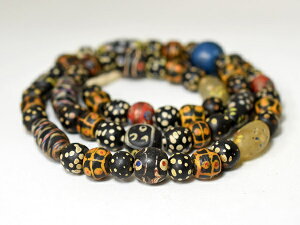 ヴェネチアンファンシービーズを模して作られた、恐らくインド製のガラスビーズ一連です。ガラスの質も模様も非常に良くできており、熟練の職人さんが作っていることが伺えます。手ごろな価格で雰囲気も良く、ボリュームがあるのでア
