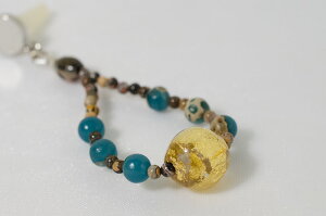 ◆グリーン系です◆シックに軽やかに、スマホや携帯音楽プレーヤーにアクセント。ハンドワークでガラス玉に金箔をとじこめた小さなストラップ。 ◆金色の玉に、心身リラックスパワーを持つといわれるジャスパーをプラス...