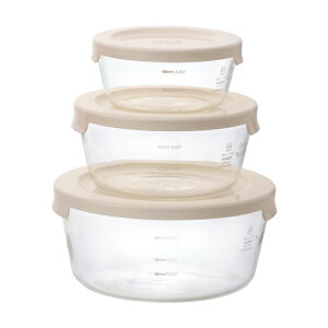 調理→保存→レンジ加熱→そのまま食卓へ。においがつきにくく、中身が見える、電子レンジが使える耐熱ガラス。必要に応じて使い分けできるサイズ違いの3種セット。コンパクトに収納できます。洗いやすい丸型形状。ラップいらずのプラ