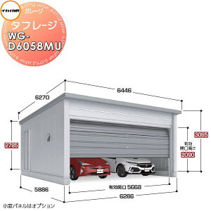 電動開閉ガレージ イナバ物置 稲葉製作所。タフレージ WG-D5458MP 一般型。サイズ(mm):間口5686×奥行5886×高さ3065。開口寸法:幅5068×高さ2090。床面積:32.57平方メートル(9.87坪)...