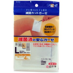ファミリーケア(FC) 滅菌カットガーゼ Lサイズ*4枚入 商品詳細 内容量:4枚サイズ(1枚):7.5×10(cm)※滅菌処理をして一枚ずつ個包装した、傷口への使用が安心なガーゼ。眼帯、マスクの当てガーゼなどとしても...