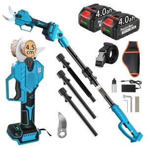 【電動剪定ばさみ45mm切断径3m延長ポールセット】▼45mm電動剪定鋏、さいだい切断径45mmの枝を楽々に切れます。開き口は15mm・20mm・45mmの3段階に調節できる、半開なら小さな開口は作業時間と電力を節約し、全開なら太い枝...