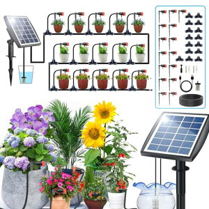 【自動水やり器セット ソーラー充電式 ポンプ式】 概要説明:ソーラー充電式のポンプ式自動水やり器セットは、バケツなどに溜めた水を汲み上げて設定した間隔で散水します。USB充電にも対応しており、手間いらずなガーデニング用の自動