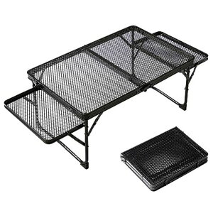 ?【目を引くディテール】:◆【傷・熱に強いカーボンスチール製天板】焚火台から火の粉が飛んでも傷付きにくく、アウトドアに最適。◆【小物入れに役立つ収納ネット】テーブル下収納として便利なネット棚。小物や食器など、使いたいと