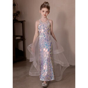 爽やかで夢幻的なライトブルーと、上品で温かみのあるシャンパンゴールドの2色から選べ、ステージ上で華やかに映えます。スパンコール装飾が光を反射し、ステージ上でキラキラと輝く仕上がり。女の子のドレスには大きなリボンがアクセ