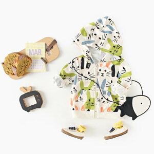 大きなうさぎのデザインがかわいらしい寒いシーズンにぴったりなフード付きコートです。 【素材について】 綿混