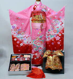 【送料無料】七五三の6〜7歳用の御着物フルセットになり肩上げを含めると全部で20点付いていますので着装に必要な物がセットになります。 御着物は白地を基調に赤やピンクなどの染分け切替になっていますので七五三の御祝いに最適な華