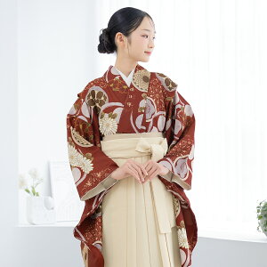 卒業式、謝恩会等に定番の二尺袖の着物と袴のセットです。昔から袴姿の着物には袖が振袖より短い二尺袖(小振袖)と呼ばれる着物が袴姿の定番の着物とされ、昔から現在も変わらず袴=二尺袖と認識される一般的なスタイルです...
