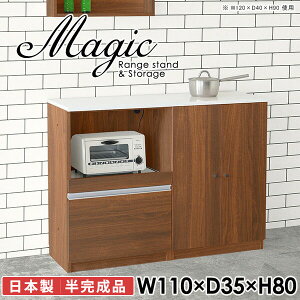 便利なコンセント付き!大容量食器棚magic レンジ台×収納庫 W110×D35×H80 木目サイズサイズ:約幅1100 奥行き350 高さ800 mm材質[天板・スライド棚]メラミン樹脂化粧合板[前板]ブラウン・ダークブラウン・チー...