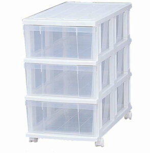 押入れ半間に2台並べて使いやすいサイズの引き出し収納。キャスターが付属しているので、お掃除の時もラクラク移動できる。中身の見やすいクリアタイプ。