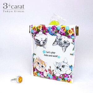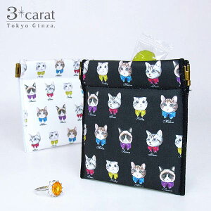 3caratオリジナルキャラクターのおめかしキャットの柄です。 内側にもワンポイントの模様が入っています。 キャンディポーチはアクセサリーやイヤホン、鍵や常備薬まで、ちょっとした小物をカンタンに収納できるバネポーチ