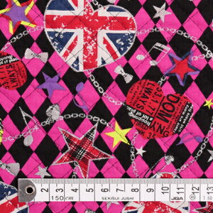 こちらの商品は、他の生地種もございます。>> シーチング生地 ラミネート(厚み0.2mm)生地■生地柄特長ショッキングピンクと黒のアーガイル模様に散りばめられた、ユニオンジャックや星、音符のロックなモチーフが存在感たっぷりです...